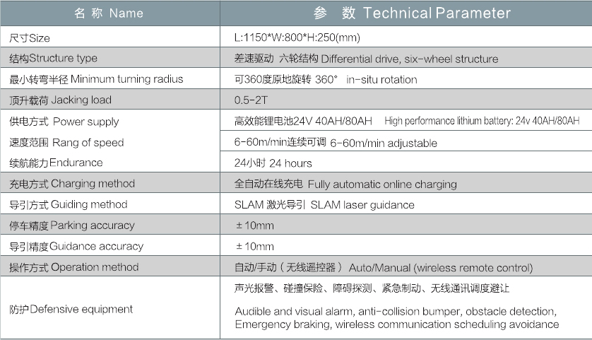 -安全防护完善:通常搭载激光雷达,实现360°安全防护检测,具备三级安全减速功能,能智能识别障碍物,主动停车或更换线路。还配备有柔性防撞条、急停按钮等接触式安全防护装置。